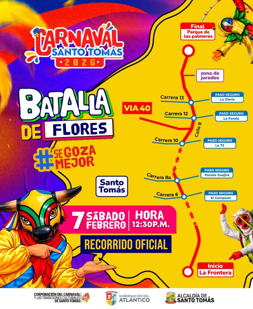 La Gobernaciòn del Atlàntico y la Alcaldìa de Santo Tomàs, a travès de la Secretaría de Gobierno y la Inspecciòn de Convivencia y Paz, dieron a conocer el nuevo recorrido y la logística oficial del desfile de La Batalla de Flores el Reinado Intermunicipal de Santo Tomàs 2026.