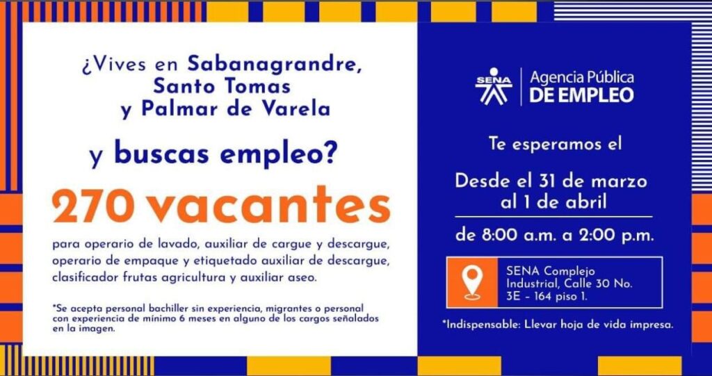 Solo para habitantes de Sabanagrande, Santo Tomás y Palmar de Varela hay 270 empleos del Sena para ti.