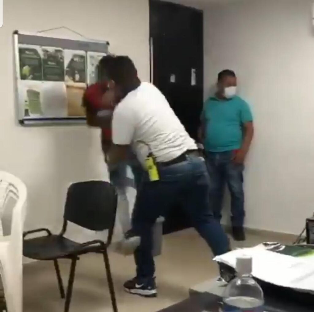 Según se puede apreciar en un video que circula en las redes, el hombre toma por el cuello al detenido y lo estrella contra la pared del lugar.