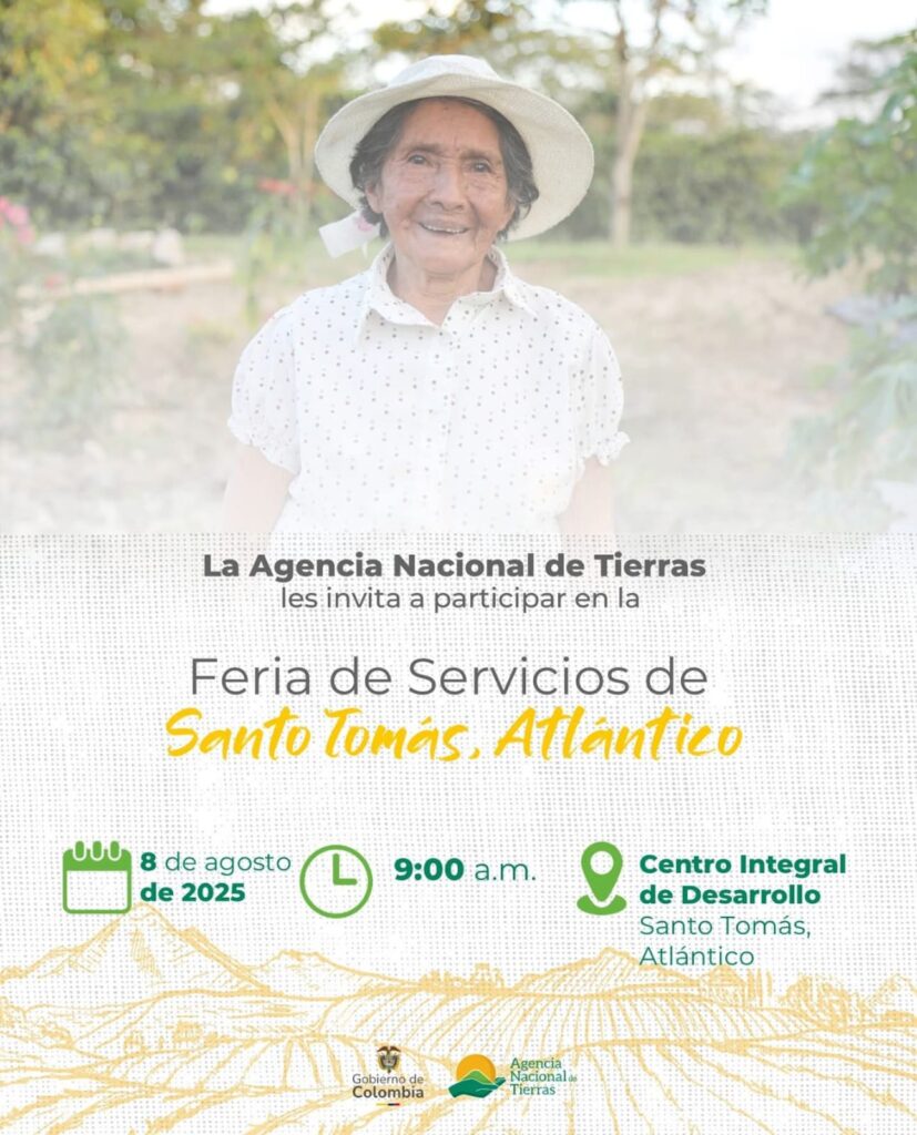 La Alcaldía Municipal de Santo Tomás, a través de su oficina de la UMATA, en colaboración con la Agencia Nacional de Tierras, tiene el gusto de invitarlos a la gran feria de servicios, la cual está dirigida a campesinos, asociaciones ya constituida y comunidad en general.