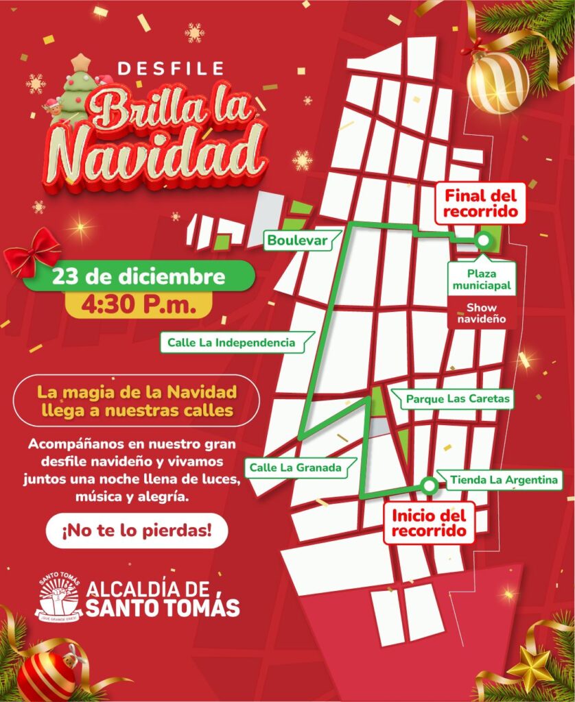 Por la seguridad de los tomasinos y visitantes desde la Alcaldía Municipal de Santo Tomás, informamos el recorrido por el Desfile Brilla la Navidad.