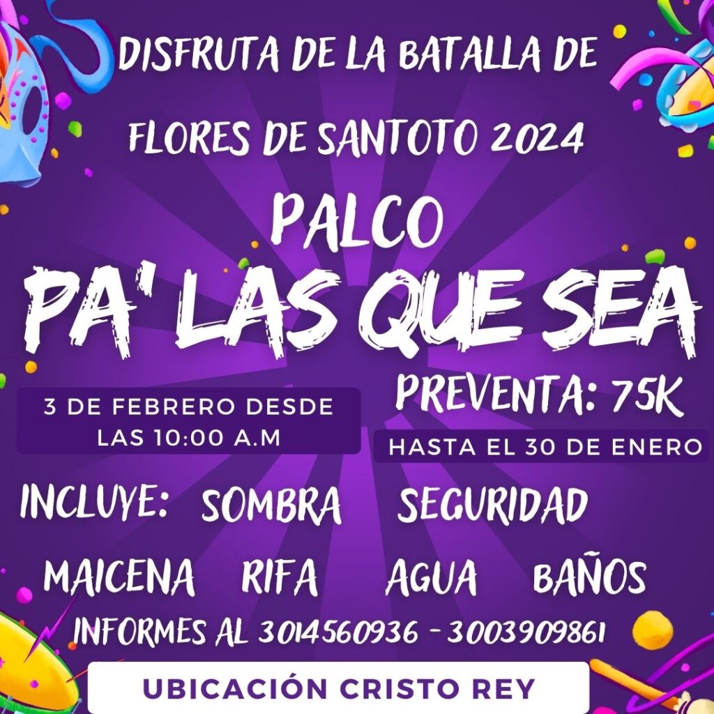 Pilas, aún puedes aprovechar la preventa del palco Pa’ las que sea, para que aprecies la batalla de flores de Santoto 2024 en el mejor lugar.