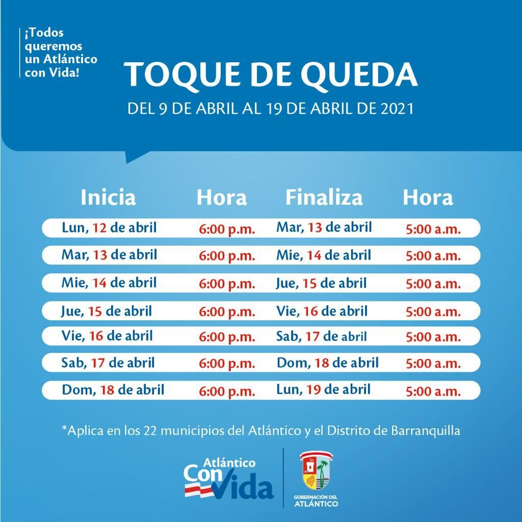 “Tomamos la determinación de seguir con el toque de queda los días de semana desde las 6:00 pm hasta las 5:00 am del día siguiente y ampliamos para este fin de semana el toque de queda, que arrancará este viernes 9 de abril a las 6:00 pm y finalizará el lunes 12 de abril a las 5:00 am., eso quiere decir que quedamos confinados en el fin de semana”, indicó Noguera.