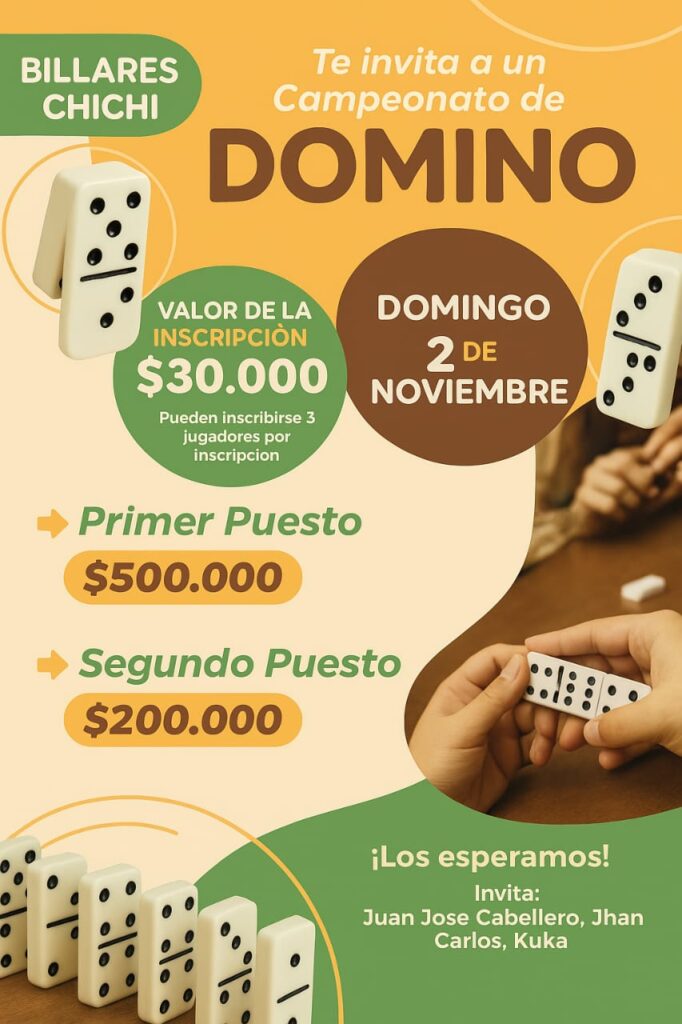 Para este domingo 2 de noviembre se ha organizado un gran campeonato de Dominó en el estadero “Billares Chichí” de Santo Tomás, el cual se encuentra ubicado en la calle 6, calle La Granada con la carrera 11 esquina.