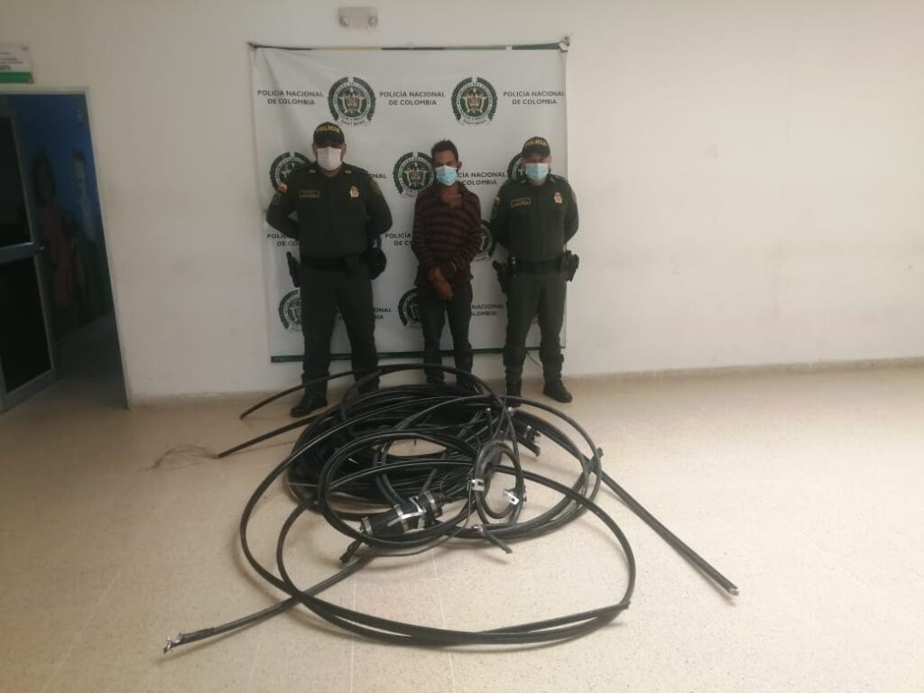 Personal de la Policía del Atlántico acantonada en Santo Tomás y dentro del plan contra el robo y atracos fue capturado un sujeto de nacionalidad venezolana, quien tenía en su poder 70 metros de cable de comunicación de internet en el barrio Los Cocos de Santo Tomás, calle 9 con la carrera 8.