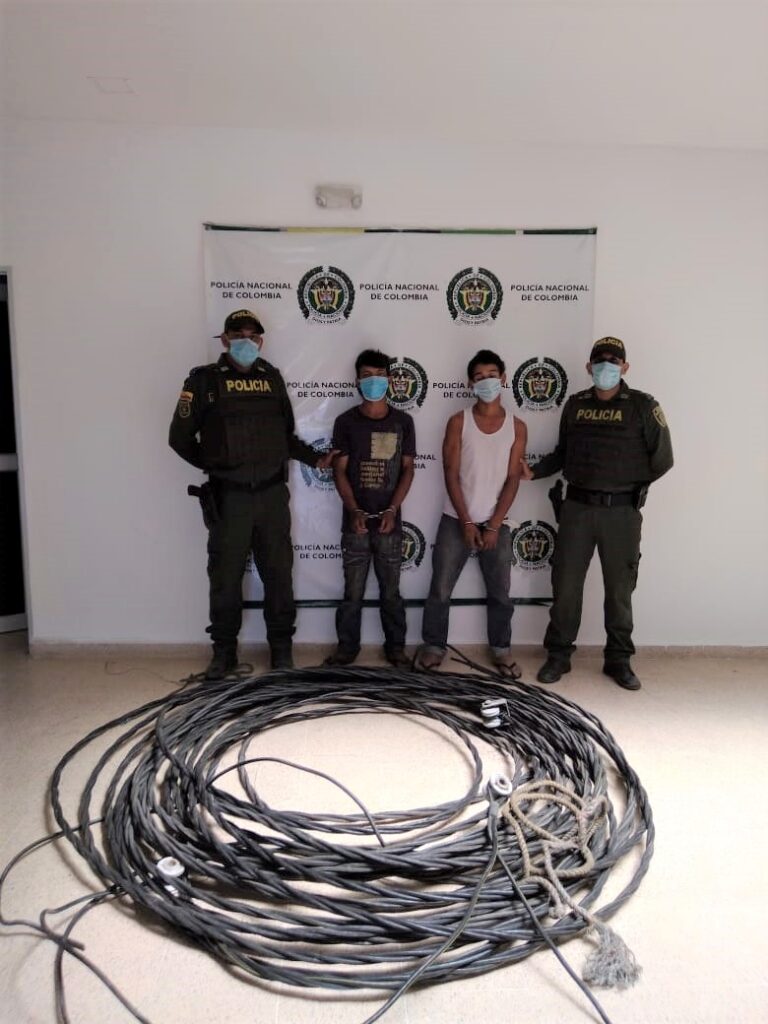 En inmediaciones del kilómetro 1, Vía a El Uvito del municipio de Santo Tomás, la Policía logró la captura en flagrancia de Danilo de la Hoz Fuentes y Jhon Jairo Ferrer Pertuz, al ser sorprendidos huyendo luego de cometer el hurto de 170 metros de cable en un ramal de una finca que se encontraba sin fluido eléctrico.