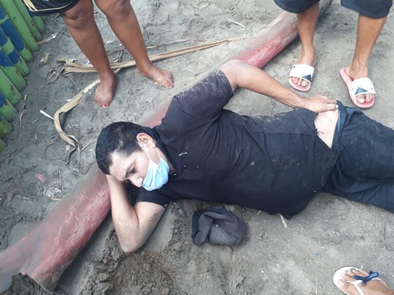 El herido de nombre José Gregorio Montalvo Pérez, de 44 años, fue socorrido y remitido a la Clínica Altos de San Vicente, donde recibe atención médica. El conductor del vehículo y su ayudante no sufrieron afectaciones, mientras que el camión que transportaba la carga pesada literalmente se lo tragó el mar.