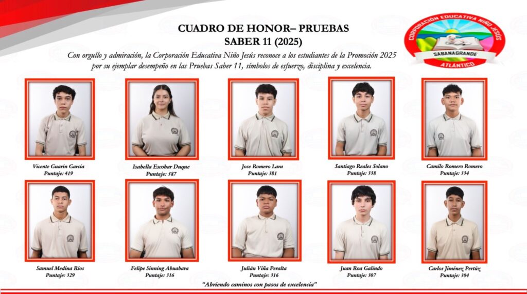 Por su parte el educador Pedro Badillo Noriega envió el siguiente mensaje a los padres de familia por intermedio de este medio de comunicación donde da a conocer los mejores puntajes de la Corporación Educativa Niño Jesús de Sabanagrande, donde manifiesta: “estimados padres de familia, reciban un cordial. La Corporación Educativa Niño Jesús, exalta a los estudiantes de la promoción 2025 por sus excelentes resultados en la Prueba Saber 11, símbolos de esfuerzo, disciplina y excelencia.