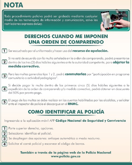 Para tal fin, la Policía Nacional socializa los siguientes temas: definición de orden de comparendo, los derechos que tiene si incurre en un comportamiento contrario a la convivencia, deberes de convivencia, derecho con los que cuenta cuando se le impone una orden de comparendo, forma de identificar al policía que realiza la orden de comparendo, entre otros temas importantes que debe conocer el ciudadano al momento de incurrir en un comportamiento contrario a la convivencia.