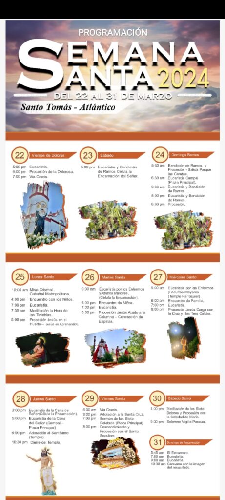 5;p.m. Eucaristía de La Cena del Señor. Campal, Plaza Principal.6: p.m. Adoración al Santísimo. En el templo.1030 P.m: Cierre del templo.29 de marzo: Viernes Santos 6:a.m. Vía Crucis.3P.m. Adoración a la Santa Cruz.7: p,m. Sermón de las 7 palabras. Plaza Principal.8: p.m. Desconocimiento y procesión con el Santo Sepulcro.30 de marzo: Sábado Santo4; p.m. Meditación de los Siete Dolores y Procesión con la Virgen de la Soledad de María.9P.m. Solemne Vigía Pascual.31 de marzo. Domingo de Resurrección.5:45 a.m. El Encuentro 7:a.m. Eucaristía.9: a.m. Eucaristía.10:30 a.m. Caravana con la imagen del Resucitado.