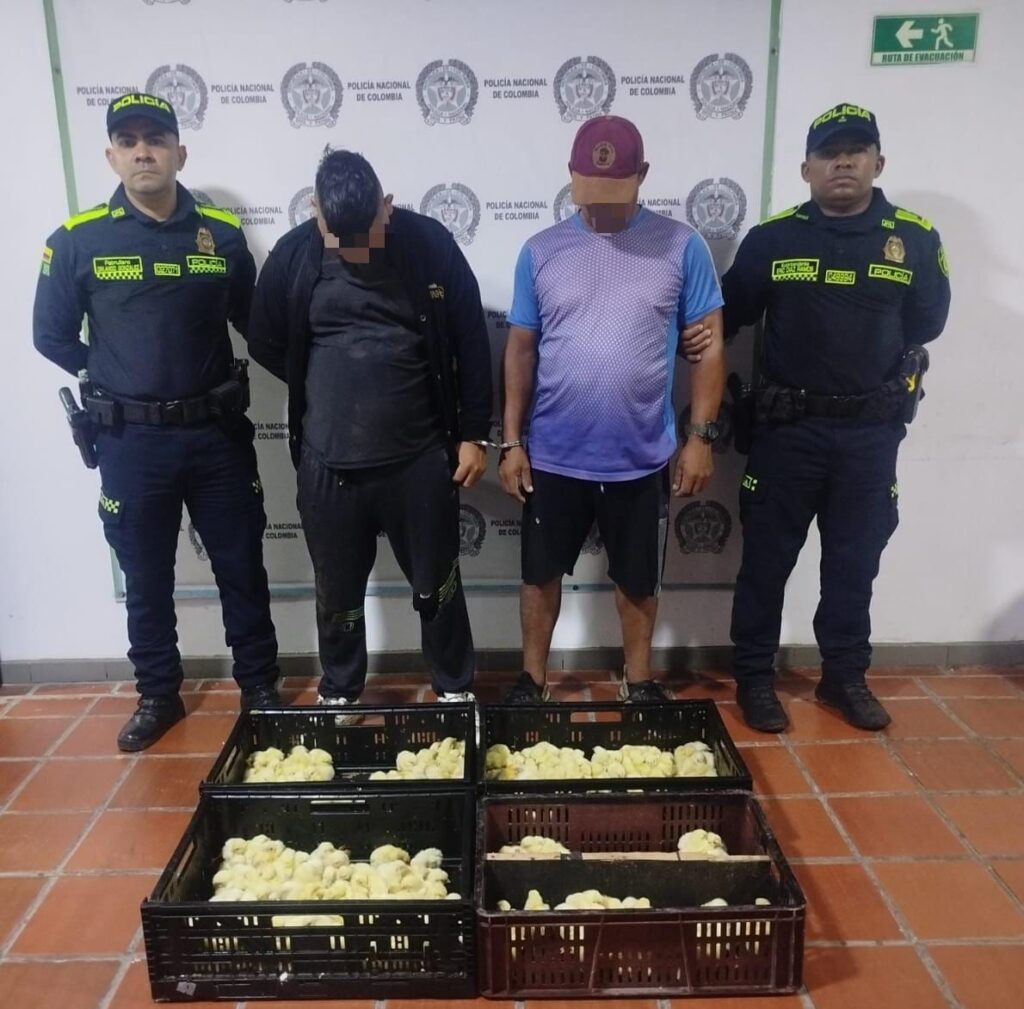 En otro resultado operativo, en el corregimiento de Campeche, fueron capturados dos hombres de 30 y 43 años por el delito de hurto, a quienes se le halló 08 canastillas plásticas tipo guacal y 2.500 pollos de purina engorde, los cuales fueron hurtados de una finca del ese sector.
