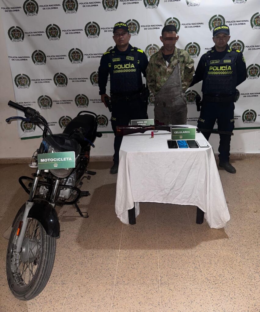 En otro operativo realizado en el barrio Primero de Mayo del municipio de Santo Tomás, fue capturado un hombre de 35 años, por los delitos de fabricación, tráfico o porte de armas de fuego o municiones y receptación, a quien se le halla en su poder un arma de fuego tipo escopeta calibre 12, y se le incauta una motocicleta que figura como hurtada.