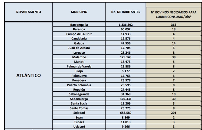 Según un habitante del municipio, en Suan existen solo 3 expendios de carnes para lo cual se necesitarían solo 2 reses, Campo de la cruz, 4 reses, Santa Lucía, 3 reses, Ponedera, 7 reses. Para un total de 16 reses máximo, según el estudio de Invima que aparece en su página web.