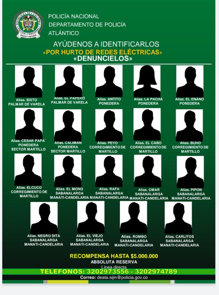 Con 19 figuras sin rostro, pero identificadas con sus alias y los municipios donde han realizado sus hurtos, la Policía Departamento del Atlántico, Deata, dio a conocer el cartel de los más buscados por robo de redes eléctricas en esta zona del país.