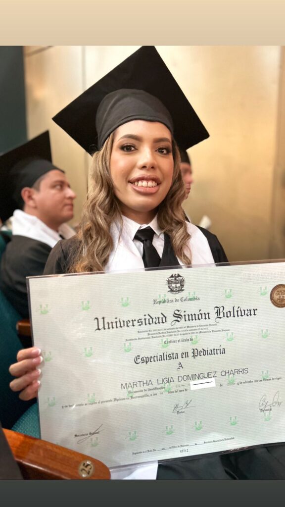El Ministerio de Educación Nacional por intermedio de la Universidad Simón Bolívar, en ceremonia llevada a cabo en horas de la mañana de hoy en el Teatro José Consuegra Higgins, recibió especialización en Pediatría, la joven Martha Ligia Domínguez Charris, motivo por el cual es felicitada por sus padres Ángel Domínguez y Elizabeth Charris Sarmiento. A estas se unen las de su hermano Ángel Domínguez Charris, sus abuelos, tíos, primos, demás familiares y amigos en especial Manuel Pérez Fruto y Estela Morales Charris, e hijos, quienes les desean muchos éxitos en su nueva carrera profesional.