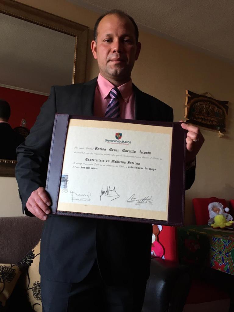 La universidad Mayor de Chile, otorgó el título de Especialista en medicina interna, al médico Carlos César Carrillo Acosta, ilustre hijo de Santo Tomás, quien forjó sus estudios en la disciplina y la responsabilidad, caracterizado por su alto compromiso profesional y gran filántropo por excelencia. El galeno recibe felicitaciones de su esposa Yuli Paola, sus hijos Sebastián, Karla Paola, Santiago y Wiston, de sus padres Carlos Carrillo y Elvina Acosta, su hermana Daysi Margarita y su cuñado Carlos Julio, su sobrina Isabella, sus abuelos Elvina Truyol, Augusto Carrillo y Amelia De la Hoz, tíos, primos y amigos. A estas felicitaciones se une su amigo Frensis Isaac Salcedo, señora e hijos, quienes desean más triunfos para que siga sumando éxitos en lo sucesivo.