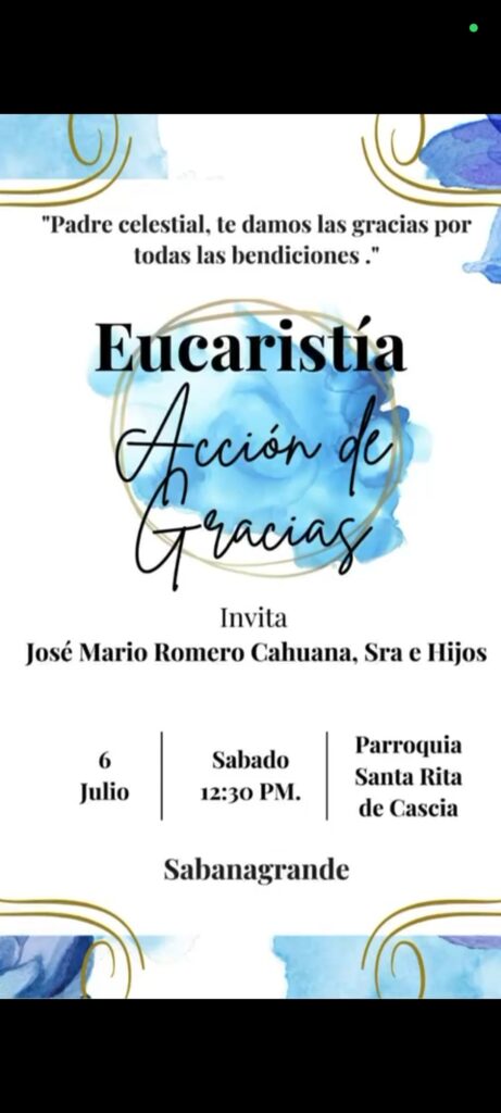 La eucaristía está programada para las 12 y 30 de la tarde en la Iglesia Parroquial Santa Rita de Casia de esa población en la Plaza Principal y el oferente está invitando a todos los sabanagranderos a que participen, agradeciéndole al “padre celestial le derrame las gracias por todas las bendiciones”.