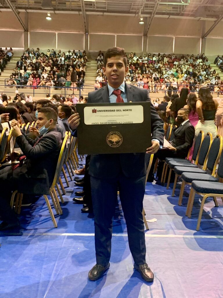 El Ministerio de Educación Nacional por intermedio de la Universidad del Norte concede en el día de hoy el título de Ingeniero Civil al joven Ángel David Domínguez Charris, quien mereció los elogios por parte de profesores y compañeros de la universidad. Recibe felicitaciones de sus padres Ángel Domínguez Salas y Elizabeth Charris Sarmiento, su hermana Martha Ligia, sus tíos, primos, demás familiares y en especial de la familia Pérez Morales, quienes le desean éxitos en su carrera profesional.