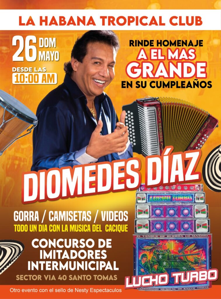 Mañana domingo 26 de mayo se cumple un aniversario más del nacimiento de uno de los más grandes de la música vallenata como fue Diomedes Díaz Maestre.El estadero La Habana Tropical Club de Santo Tomás, ubicado en el sector de la Vía 40, sus representantes han organizado este homenaje a este personaje desde las 11 de la mañana y donde habrá concurso de imitadores a nivel intermunicipal. Habrá de la misma manera la entrega de gorras, camisetas y videos.Esto va a ser una gran fiesta vallenata, acompañada del turbo de Lucho. Cervezas bien frías, licores nacionales y extranjeros y servicio de restaurante.Todos pues mañana domingo al estadero La Habana Tropical Club desde las 10 de la mañana a gozar y disfrutar de un día especial en Santo Tomás.