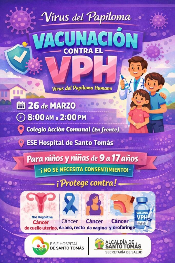 El Hospital de Santo Tomàs en coordinación con la Alcaldìa Municipal invitan a toda la comunidad a participar en la jornada de vacunación contra l VPH (virus del Papiloma Humano), una acción fundamental para la protección de la salud de nuestros niños y niñas.