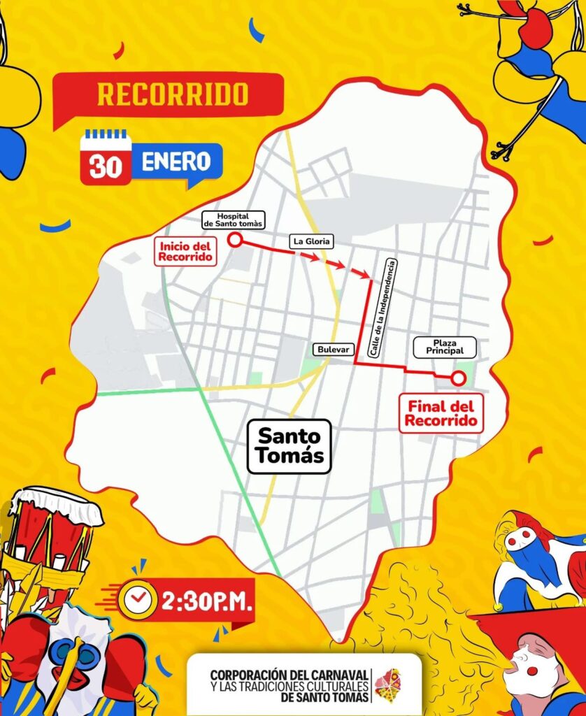 La concentración de las reinas intermunicipales y los grupos folclóricos será a las dos de la tarde frente al Hospital Local. El desfile se inicia a las tres de la tarde, bajando por toda la carrera 12, hasta la calle 8 la carretera, donde dobla para llegar al boulevard, frente al cementerio municipal y baja por toda la carrera 11, pasa por la calle 5, luego llega a la 4 hasta la Plaza Principal.