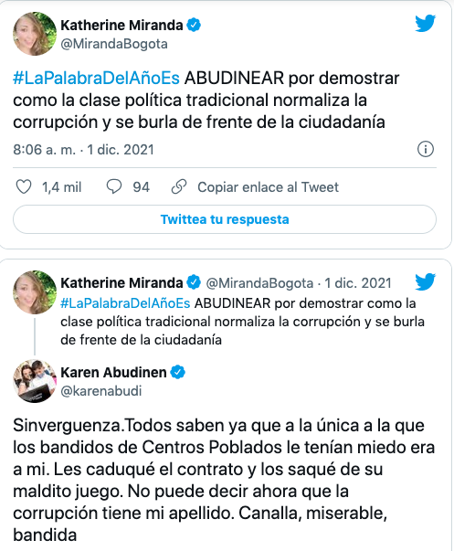 La pelea se desató cuando la congresista dijo que, a propósito del año que termina, la palabra del 2021 fue “abudinear”: “#LaPalabraDelAñoEs ABUDINEAR, por demostrar como la clase política tradicional normaliza la corrupción y se burla de frente de la ciudadanía”, escribió.