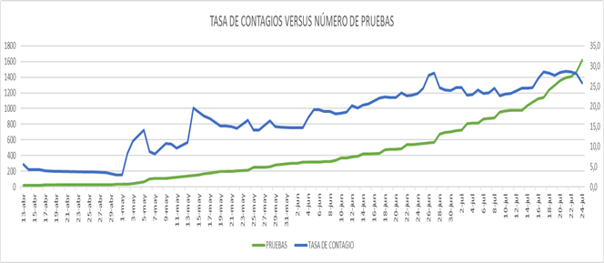 A fecha del 24 de julio la tasa de contagio es del 26% y la tasa más alta, se verificó el 17 de julio con un 29%. La curva viene en descenso.
