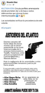 Señala el panfleto que: “estamos cansados del fuerte oleaje de atracos masivos que se vienen presentando en los buses intermunicipales de la empresa Cootransoriente, Trasalfa, Transmecar, entre otros en la trayectoria de El Concorde, Malambo y Manuela Beltrán en Soledad.