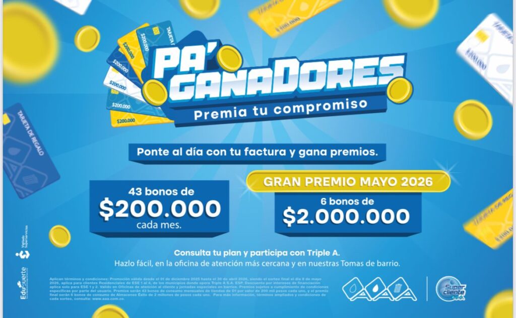 Barranquilla, diciembre 1 de 2025. Triple A anunció el lanzamiento de su campaña “Pa’Ganadores – Premia tu compromiso”, una iniciativa dirigida a los usuarios residenciales de estratos 1, 2, 3 y 4 en los 14 municipios donde la empresa presta sus servicios. El objetivo principal es promover el pago oportuno, disminuir la morosidad y facilitar la normalización de obligaciones en mora.