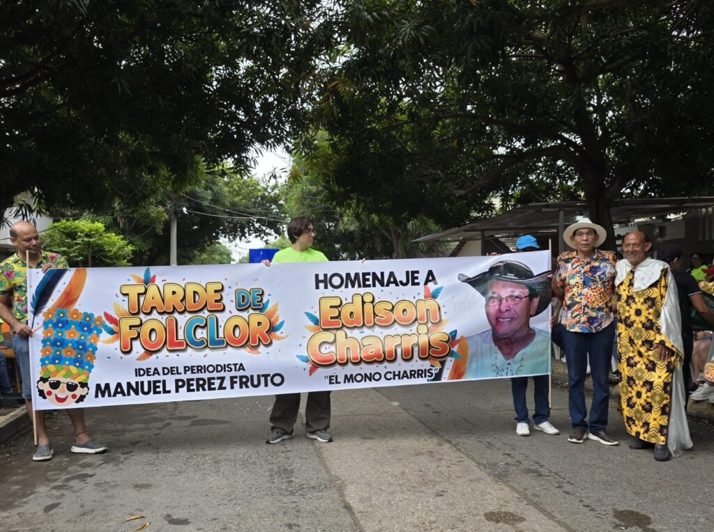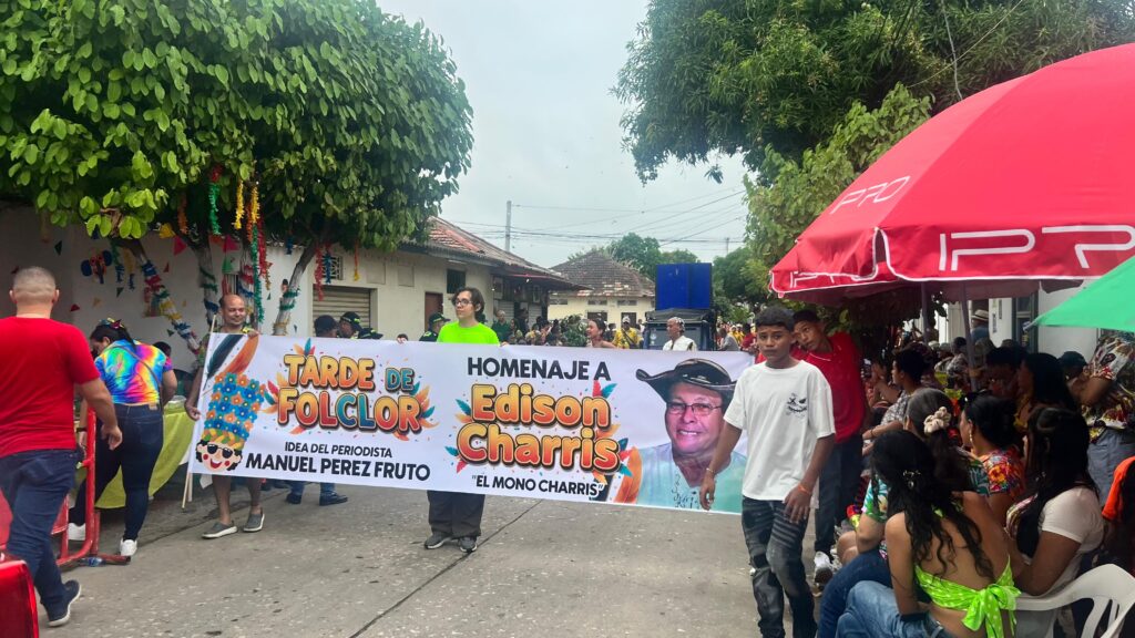 Aplausos y fotos al pendòn o pasacalle donde se hizo la imprenta del homenaje al folclorista, educador y defensor del carnaval por mas de 20 años, Edinson Charris Carrillo, conocido cariñosamente como “El Mono Charris”, ya fallecido.