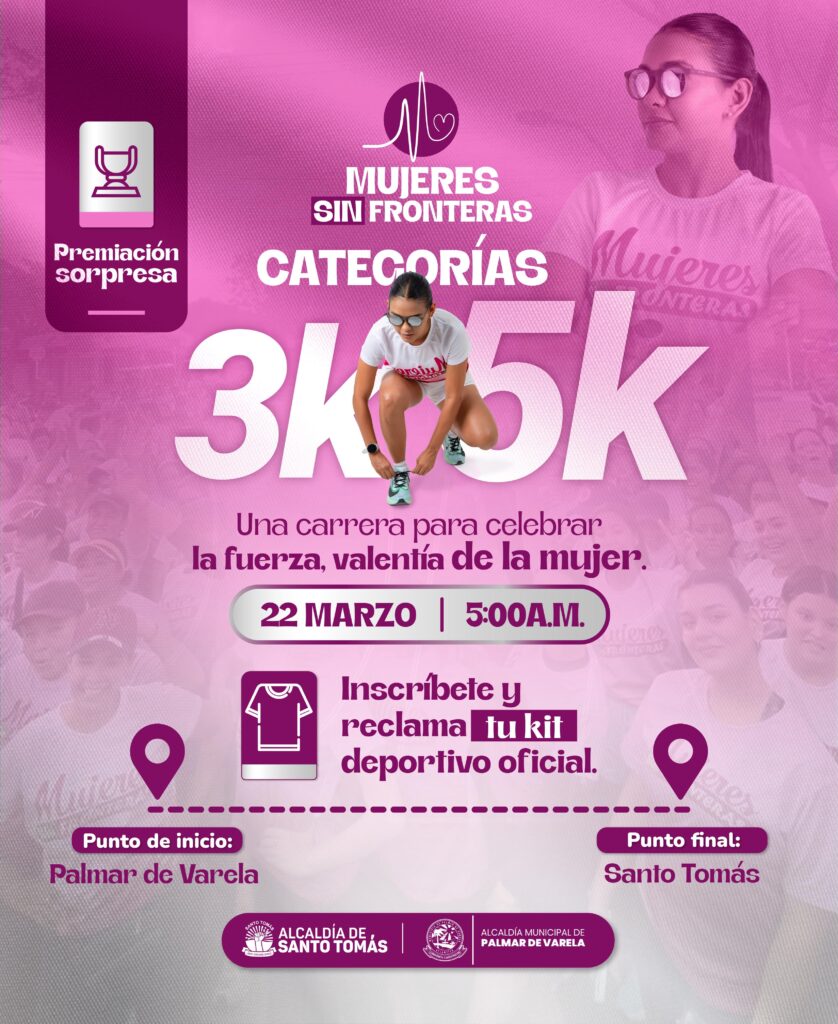 Indicò al mismo tiempo “hoy tenemos muchas mujeres inscritas, pasando el número de mas de 800 y que se van a vincular a esta gran competencia o actividad, que hemos organizado para conmemorar a la mujer tomasina y palmarina, en esta oportunidad. El inicio de la carrera será en el municipio de Santo Tomàs y finaliza en los alrededores del cementerio municipal de Palmar de Varela, donde serán recibidos por los alcaldes de Santo Tomàs, Paula Hun Badillo y de Palmar, Josè Junior Rùa Fontalvo”.