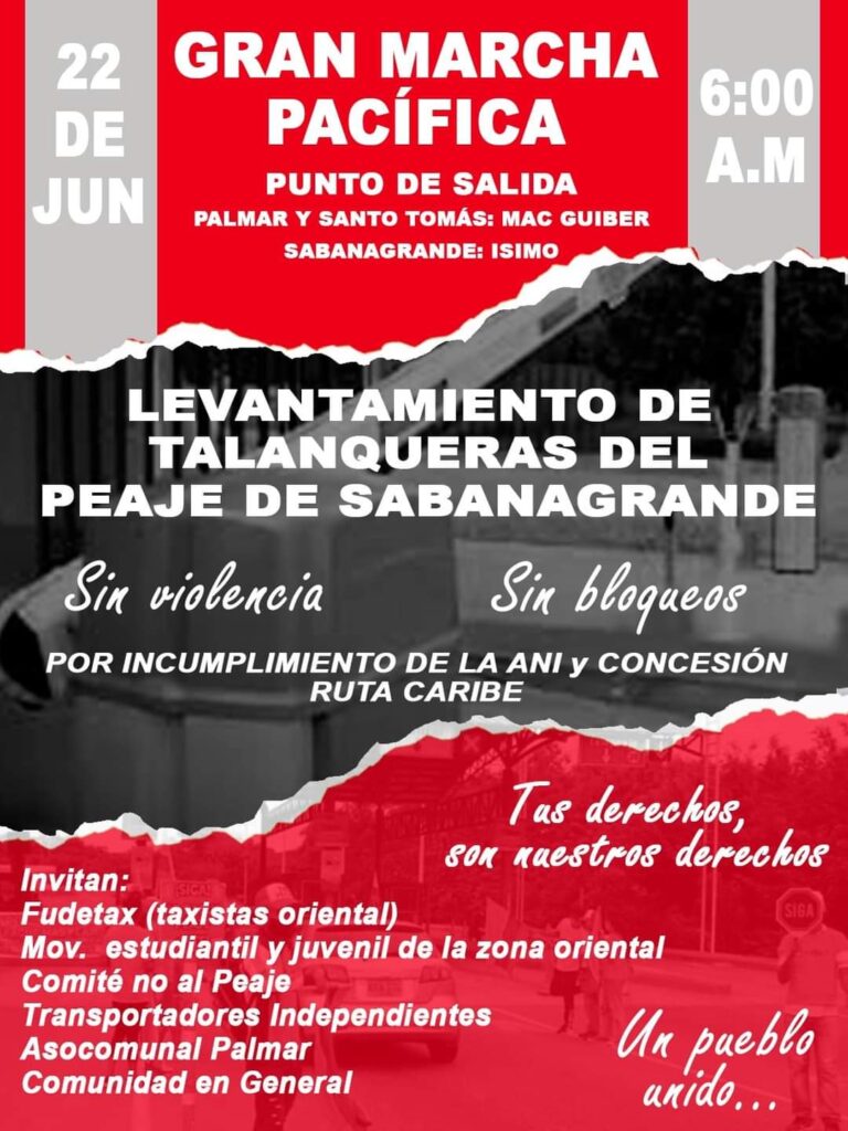 Este sábado 22 de junio, el exalcalde de Sabanagrande, Gustavo De la Rosa Berdejo y el grupo contra peaje, liderado en la zona oriental por el líder Rubén Darío Llanos Sarmiento han anunciado una marcha pacífica, en protesta contra al peaje del municipio de Sabanagrande con el objetivo de denunciar las tarifas elevadas y la falta de cumplimiento de las inversiones promovidas por la concesión responsable.