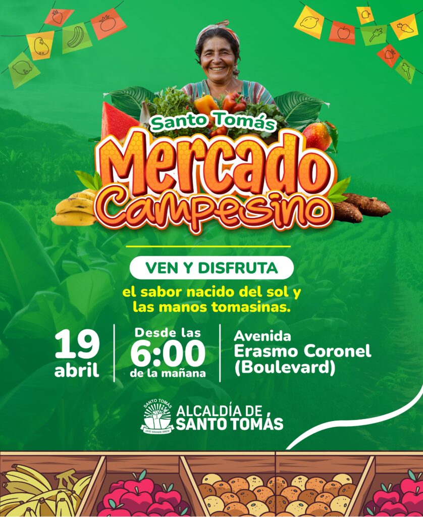 La alcaldía municipal de Santo Tomás está invitando a la comunidad de esta localidad para que se acerque este domingo 19 de abril, a partir de las 6 de la mañana, donde nuestros productores locales traen lo mejor del campo directo a tu mesa.