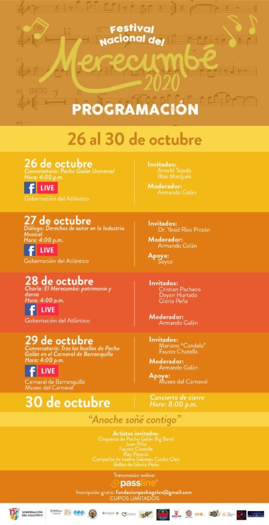 Ante la emergencia sanitaria que vive el mundo y en especial Colombia por el Covid19, este evento en el 2020 migró a la virtualidad, por lo que, del 26 al 30 de octubre se realizará la programación y será transmitido por las redes sociales de Festimerecumbé, la Gobernación del Atlántico y el Carnaval de Barranquilla.