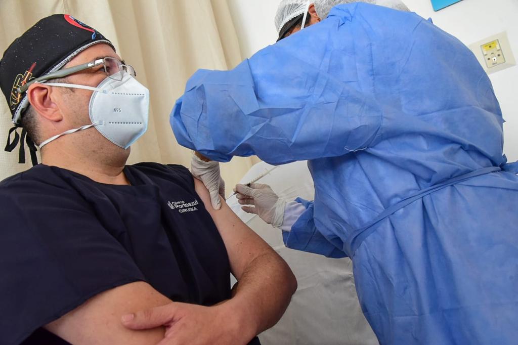 El primero en vacunarse en la IPS privada fue el jefe de la Unidad de Cuidados Intensivos y de hospitalización, Guillermo Oeding Ángulo, quien recibió con optimismo la vacuna de la vida.