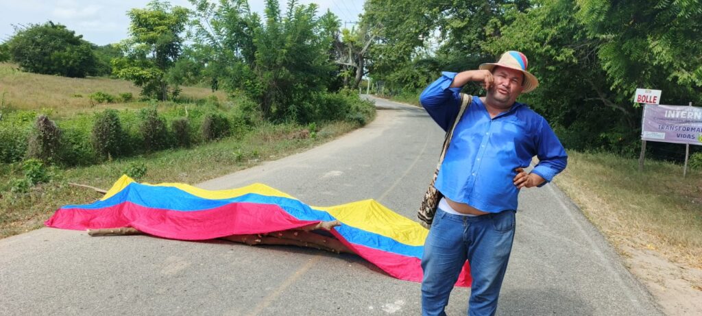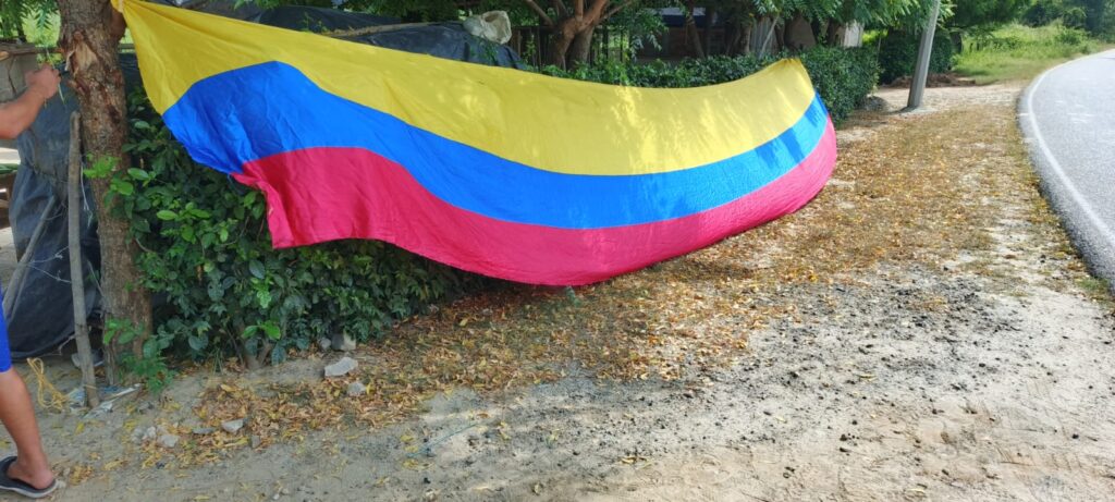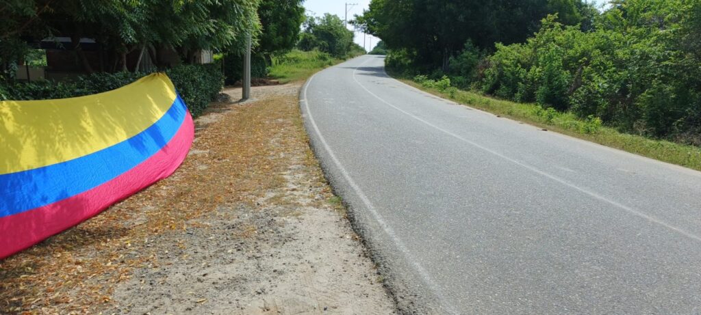 Más de 20 personas lo acompañaron desde esa hora hasta pasadas las 5 de la tarde en el sitio conocido como “La Gallera”. En un carril de la vía colocaron palos y encima de los mismos dos banderas grandes de Colombia.