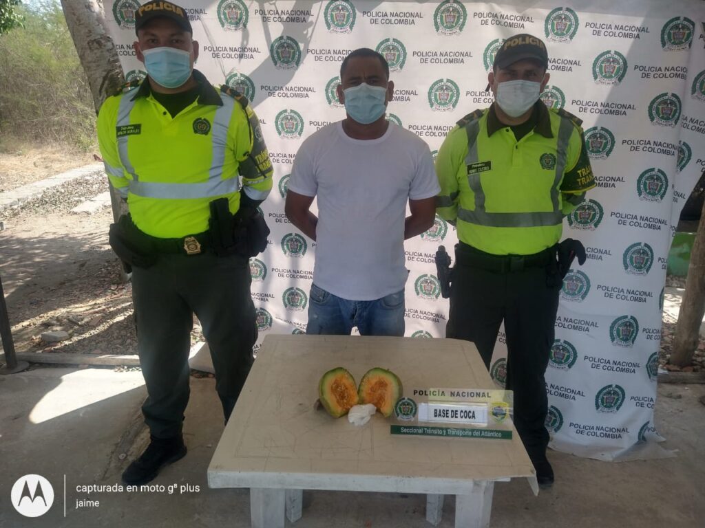 Mediante planes de registro, control y prevención sobre la vía oriental a la altura del kilómetro 64 + 700, en el peaje de Sabanagrande, personal de esa unidad policial realiza la señal de pare a un autobús de servicio público, el cual cubría la ruta Barranquilla – Carmen de Bolívar, y proceden a realizar el registro rutinario a los pasajero hallando un alcaloide camuflado en el interior de un melón.