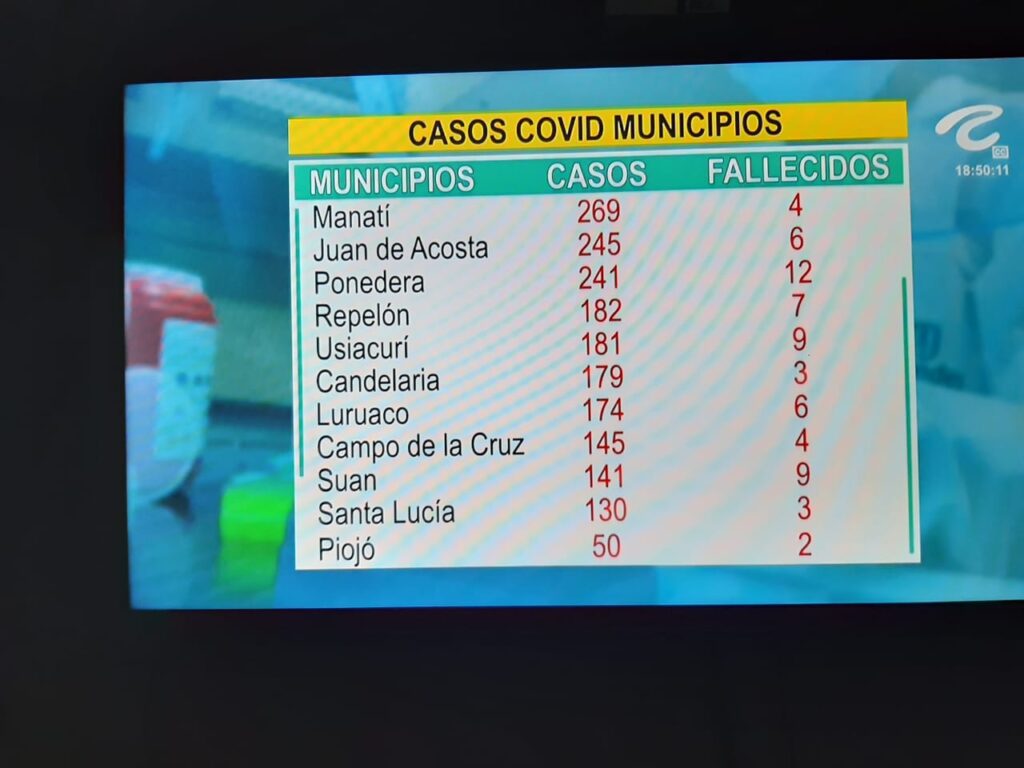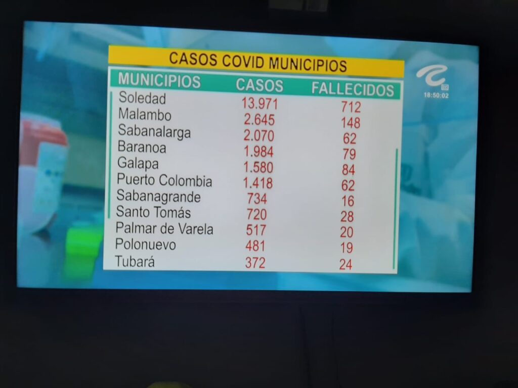 Los casos positivos en los 22 municipios del Departamento del Atlántico pero no está incluida la capital Barranquilla, teniendo en cuenta que en cada uno de esas cifras no se descuentan los recuperados son los siguientes: Soledad 13.971 casos y fallecidos 712, Malambo 2.645 casos, 148 muertos, Sabanalarga 2.070 casos, 62 fallecidos, Baranoa 1.984 casos, 79 muertos, Galapa 1.580 casos, 84 fallecidos, Puerto Colombia 1.418 casos, 62 muertos, Sabanagrande 734 casos, 16 fallecimientos, Santo Tomás 720 casos, 28 muertos, Palmar de Varela 517 casos, 20 fallecidos, Polonuevo 481 casos, 19 muertos, Tubará 372 casos, 24 fallecidos, Manatí 269 casos, 4 muertos, Juan de Acosta 245 casos,6 fallecidos, Ponedera 241 casos, 12 fallecidos, Repelón 182 casos, 7 muertos, Usiacurí 181 casos 9 muertos, Candelaria 179 casos, 3 fallecidos, Luruaco 174 casos, 6 muertos, Campo de la Cruz 145 casos, 4 fallecimientos, Suan 141 casos, 9 muertos, Santa Lucía 130 casos, 3 fallecimientos y Piojó 50 casos con 2 fallecidos.