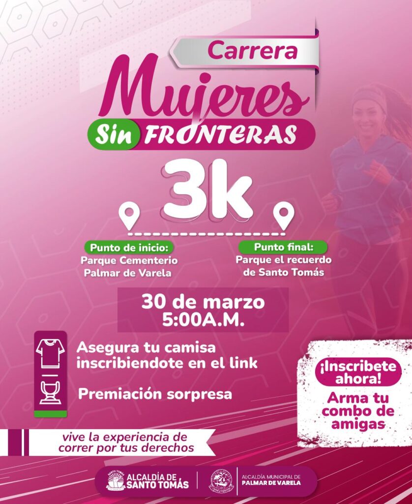 Las alcaldías de Santo Tomás, en cabeza de Paula Hun Badillo y Palmar de Varela, Junior Rúa se han unido para dar el cierre al mes de la mujer con una actividad deportiva para correr juntos, aproximadamente 3 kilómetros por el derecho de tofas las mujeres.
