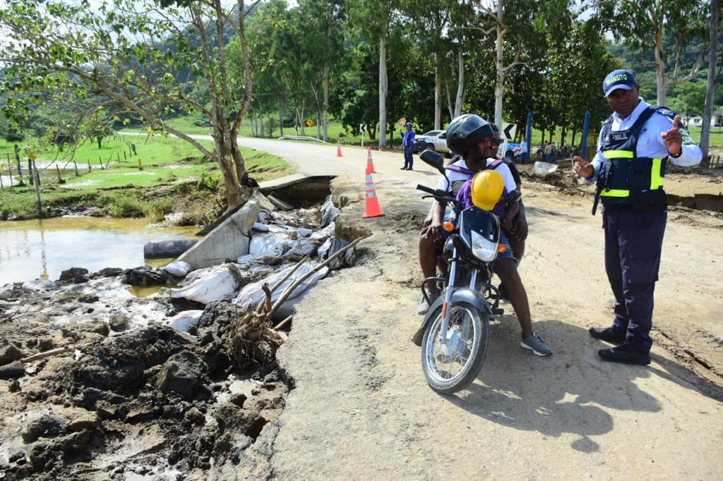 “Esta vía es realmente un puente que conecta a dos comunidades. Desde que empezaron las lluvias el sábado anterior, el agua del arroyo que cruza debajo del puente empezó a subir de nivel y a socavarlo, hasta que terminó desmoronándose, pasando sobre la vía con mucha fuerza e impidiendo el tráfico. Desde entonces, estoy aquí con mis compañeros promotores viales para mantener la vía cerrada, total o parcialmente, hasta que se mejore la situación, evitando que se ponga en riesgo la vida de los que suelen utilizar esta vía”, explicó el agente Horta, mientras vigilaba cómo una familia cruzaba a pie junto a los conos que más temprano había instalado.