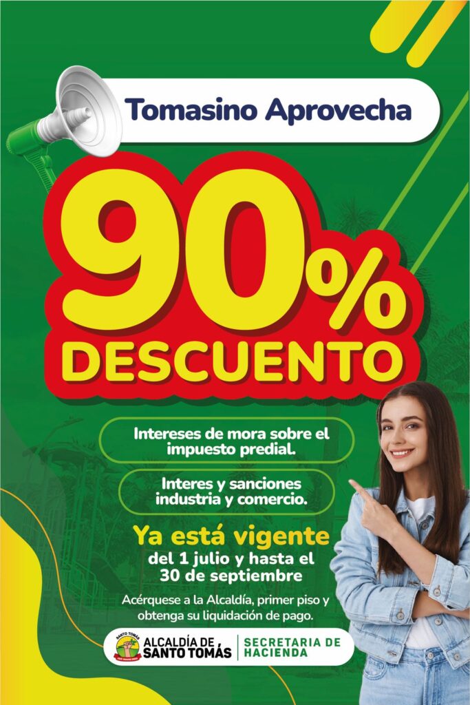 Los habitantes de Santo Tomás tienen una gran oferta de parte de la secretaría de Hacienda de este municipio con el pago del impuesto predial y también sobre los intereses y sanciones en cuanto a la industria y comercio con un descuento del 90 por ciento. Aprovechen.
