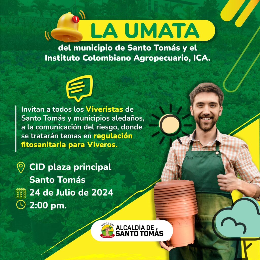 Otra de las campañas de la alcaldía de Santo Tomás tiene que ver con la Unidad Municipal de Asistencia Técnica y Agropecuaria (Umata), de este municipio y el Instituto Colombiano Agropecuario ICA, que invitan a todos los viveristas de este municipio y municipios vecinos de Sabanagrande, Malambo y Palmar de Varela a la mesa de trabajo: “Comunicación de Riesgo”, donde se tratará temas vinculados con la regulación fitosanitaria para viveros. Aquí presentamos algunos de los aspectos fundamentales que se abordaran: